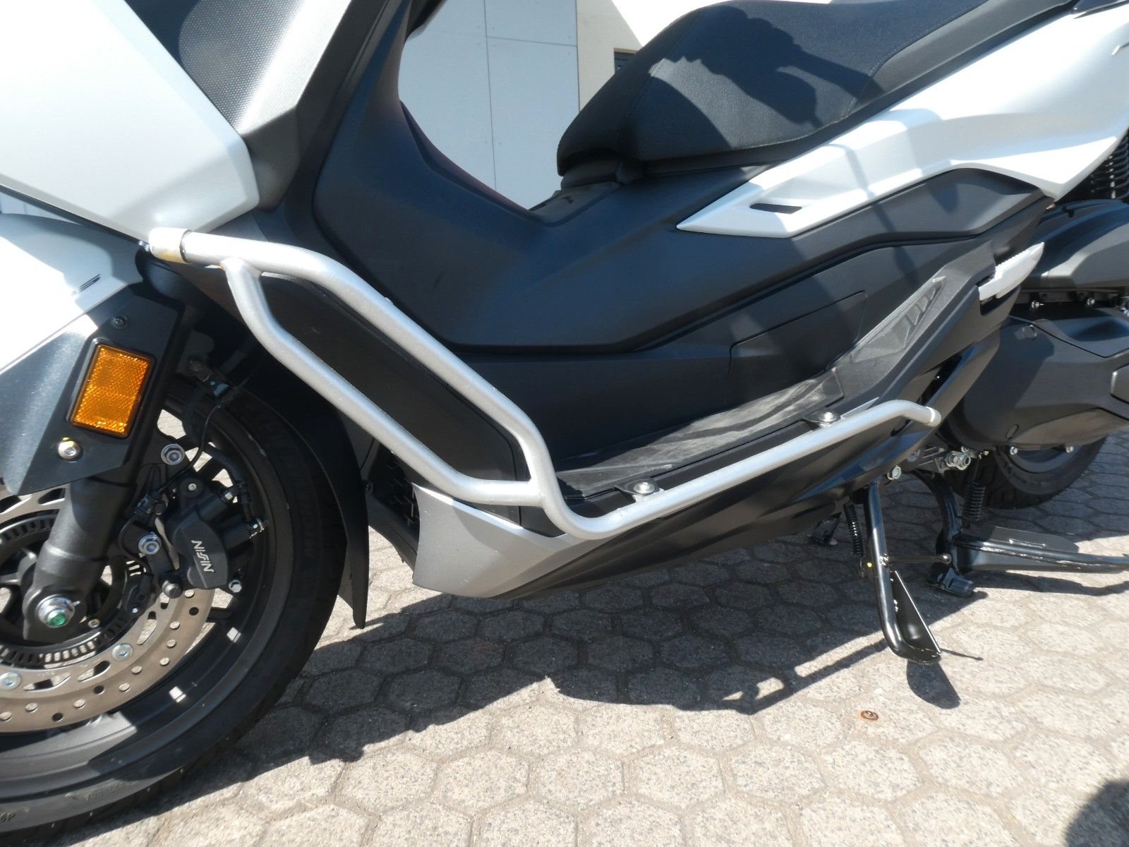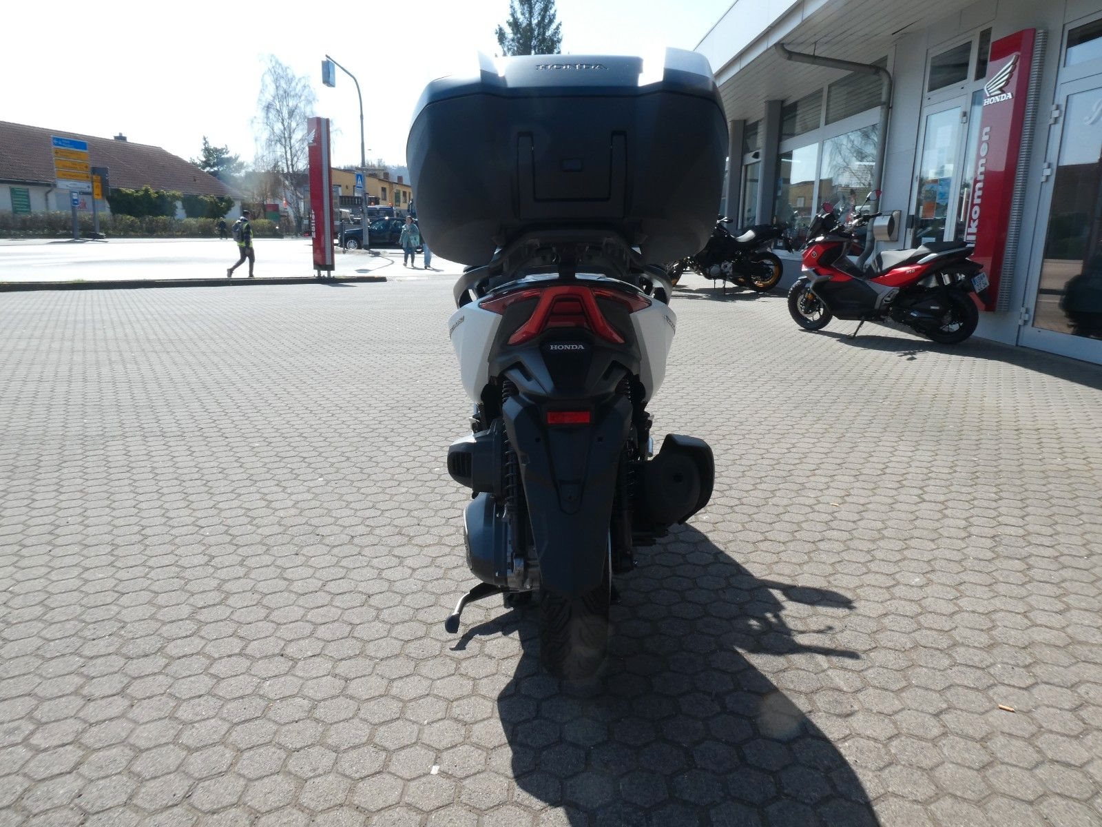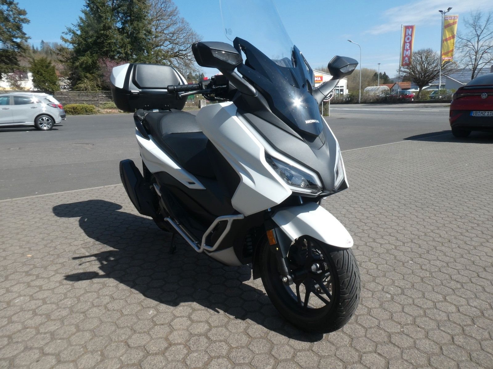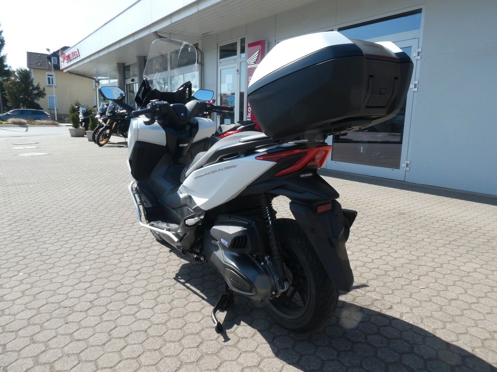 Natürlich muss ein Roller nicht nur gut aussehen, sondern auch praktisch sein. Und auch hier punktet der Forza 350: Unter den Sitzen gibt es einen riesigen Stauraum - genug für zwei Integralhelme. Der elektrisch verstellbare Windschild schützt vor dem Fahrtwind oder sorgt für einen kühlenden Luftstrom. Im Handschuhfach auf der linken Seite gibt es eine USB-Buchse (Typ C), an der du beim Fahren dein Smartphone aufladen kannst. Oder wie wäre es mit dem auf Wunsch erhältlichen Smart Top Case, das 45 Liter fasst und sich mit dem SMART Key des Forza 350 öffnen und verriegeln lässt. Für zusätzliche Sicherheit sorgt die LED-Beleuchtung unter dem Sitz, die dem Fahrer eine bessere Sicht auf den Stauraum ermöglicht.
