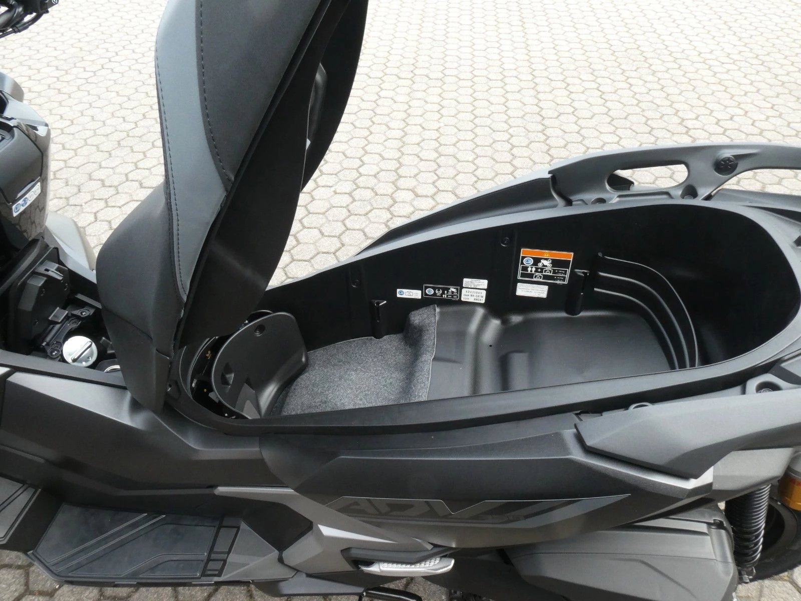 Während sich der ADV350 durch sein robustes Abenteuerdesign auszeichnet, haben wir dafür gesorgt, dass er dem treu bleibt, was große Roller ausmacht: Komfort und Praktikabilität. Der Sitz bietet guten Halt und ist nur 795 mm hoch, damit du mit den Füßen bequem den Boden erreichst. Unter den Sitzen gibt es 48 Liter Stauraum - genug für zwei Integralhelme - und ein Handschuhfach mit USB-Typ-C-Anschluss. Die LED-Beleuchtung im Fach unter dem Sitz verbessert im Dunkeln die Übersicht. Der Windschirm lässt sich in vier Stufen verstellen, sodass du die Höhe und den Winkel an deine Bedürfnisse anpassen kannst. In der hohen Einstellung wird der Luftstrom um deine Schultern herumgeleitet und verringert so bei längeren Fahrten die Ermüdung. Niedrig eingestellt, lässt sie eine kühlende Brise zu, perfekt für Fahrten in der Stadt.